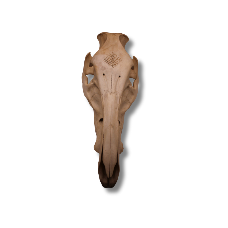 Tai ne tik interjero detalė, bet ir tikras gamtos trofėjus, atkeliavęs iš gūdžių Lietuvos miškų. Ši natūrali, kruopščiai paruošta šerno („knyslio“) kaukolė sujungia laukinio žvėries vitališkumą su sakraline baltų simbolika. Kaktos srityje išraižytas Perkūno ženklas paverčia šį objektą galingu namų sergėtoju.
