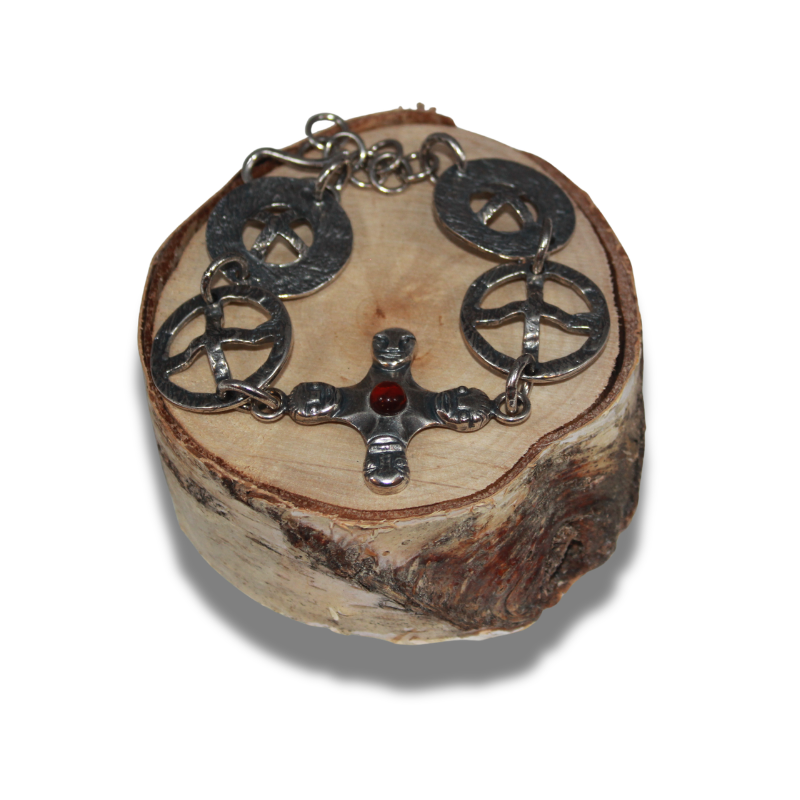 Apyrankė su Saulės amuletais ir gintaru „Baltų gyvenimo etapai“. Ši apyrankė – tai ne tik papuošalas, bet ir dvasinis turtas. Tai prabangus rankų darbo kūrinys, kuriame susipina senovės Baltų išmintis, apsauginė simbolika ir gydomoji gamtos galia. Kiekviena detalė čia turi savo paskirtį ir istoriją.